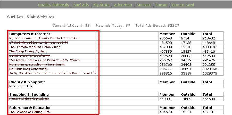 Как вы поняли так зарабатывать большие деньги будет не легко. Что же делать? Бросить это работу? Не в коем случаи. Просто найдите себе Refferалов. Которые будут при регистрации выписывать ваш login в поле Referrer (if any): И они станут вашим рефералом (ведь рефералом ссылки предоставляются в два раза больше, так как сколько ссылок будет у главного (в этом случаи это вы) столько будет и у рефералов). Тут уже деньги реальные скажем за месяц вы нашли 10 реальных людей которые хотя так заработать. Каждый день каждый эти рефералы в среднем пройдут по 20 ссылок, это значит что каждый заработает 20 центов. Теперь получается такое дело 20 центов умножаем на 10 ваших рефералов добовляем 20 своих заработанных центов и того в день вы заработаете 2,20 американских долларов. То есть сколько заработает реферал столько заработаете и вы. А реферал будет вам благодарен так как ссылкок у него будет больше. То есть имея 10 рефералов вы можете месяц заработать 66 у.е. Кроме это чем больше рефералов тем больше ссылок будет в вашей группе. Если у вас будет 20 рефералов вы можете не работаю в месяц получать по 100 у.е. Как же найти рефералов. Вы можете разместит разные объявления которое может привлечь внимание. Так как это не лохотрон, bux.to зарабатывает за счет других сайтов которые, хотя увеличить число посещений. То есть сайт плотит 16 у.е. за 1000 посещений, bux.to 10у.е отдает своим рабочим (в этом случаи это - мы) а 6 оставляет себе. Кроме этого у вас наверняка найдется свой круг друзей которые хотели бы подработать. Попробуй ты найти рефералов не трудное дело.